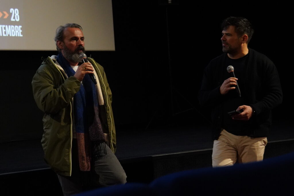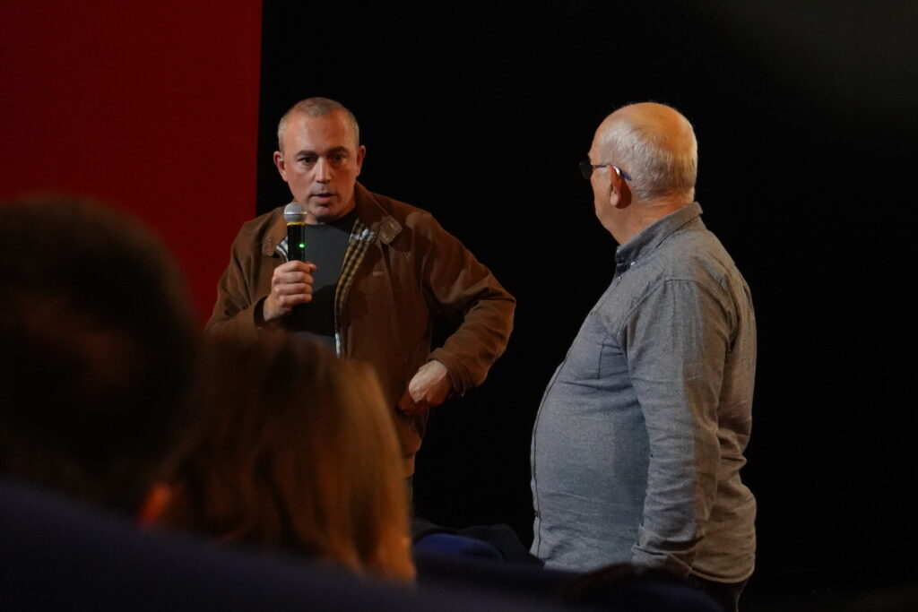 Photo 8 – Séance du court au long au cinéma Les Montreurs d’Images à Agen. Diagonale du vide de Hubert Charuel suivie d’une projection en avant première de son long métrage Météors. Sur la photo : Stéphane Rideau, comédien dans Météors et Hervé Bonnet. ©Alix Desplats