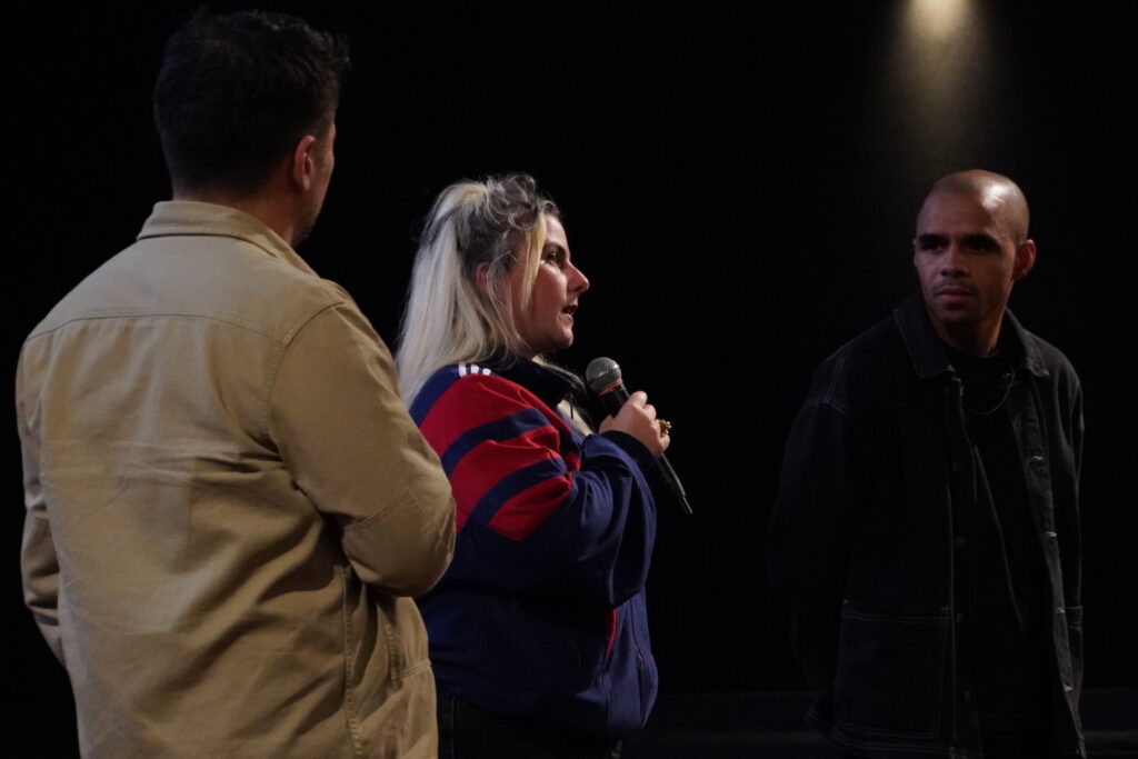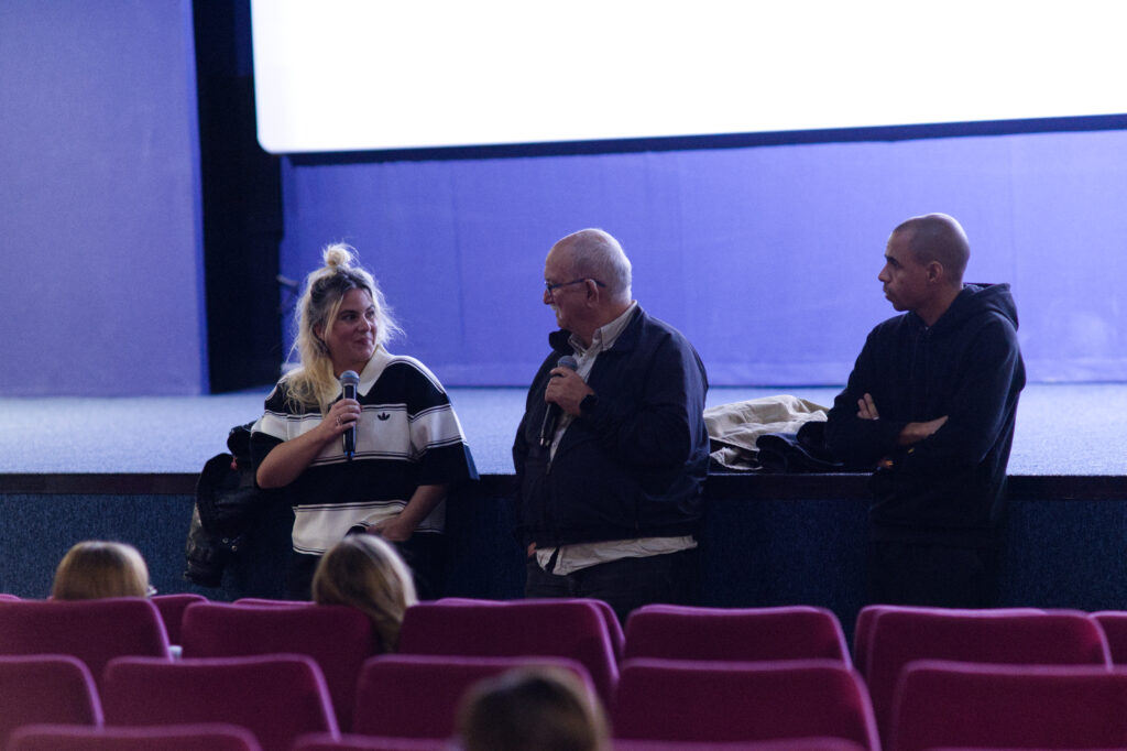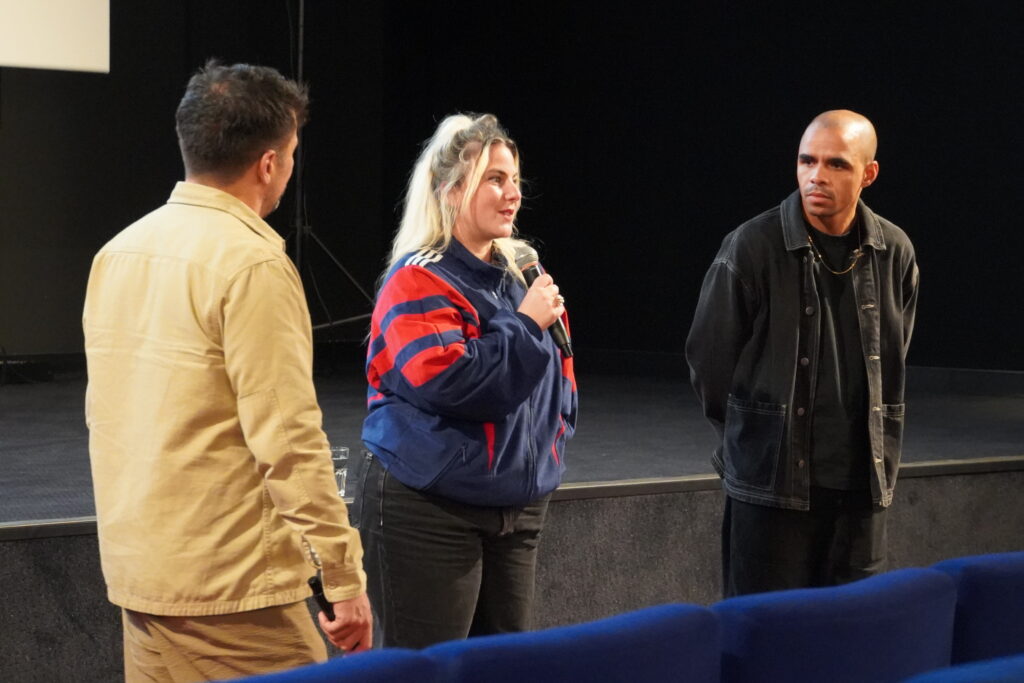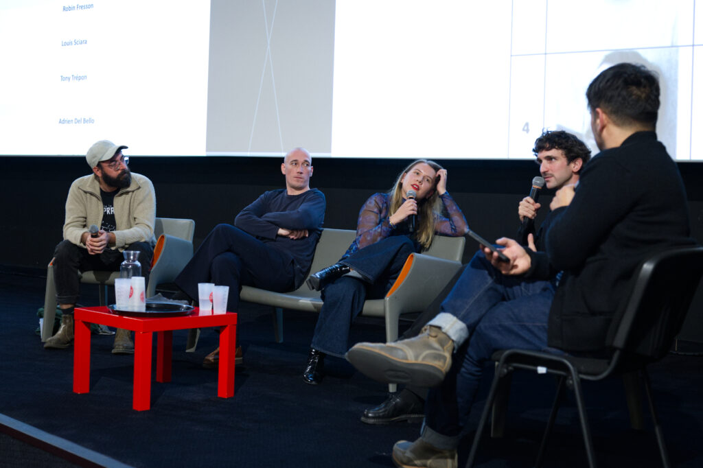 Photo 3 – Projection du film Muscle suivi d’une masterclasse en compagnie d’une partie de l’équipe du film. Sur la photo : Léo Thérial, régisseur général, Joran Leroux-Gipouloux, monteur, Lysa Lamorisse, directrice de production et Lucas Duchemin, réalisateur (de gauche à droite). ©Alix Desplats