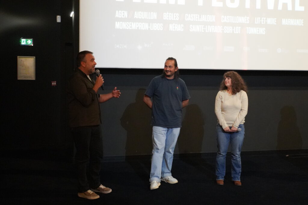 Photo 6 – Séance du court au long au cinéma Le Margot à Nérac. Projection de Gabber Lover d’Anna Cazenave-Cambet suivie de son long métrage en avant-première Love me tender. Sur la photo : Anna Cazenave-Cambet, Kristy Baboul, chef opérateur sur Love me tender et Philippe Quaillet. ©Alix Desplats